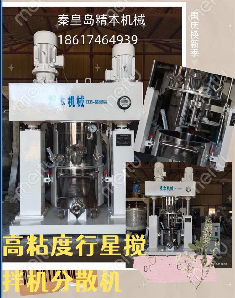 行星攪拌機通常有2個或3個多層折頁式槳葉,槳葉在公轉的同時也自轉,使物料上下及四周流動,從而可在很短時間內達到混合效果。行星攪拌機缸體內壁為大型立車精加工,再經大型拋光機自動拋光,確保行星架上的活動刮刀在旋轉時,把缸體內壁上的物料完全刮掉;該機特別適合膏體、高黏度、高密度的物料溶解、混合、混煉、聚合等。